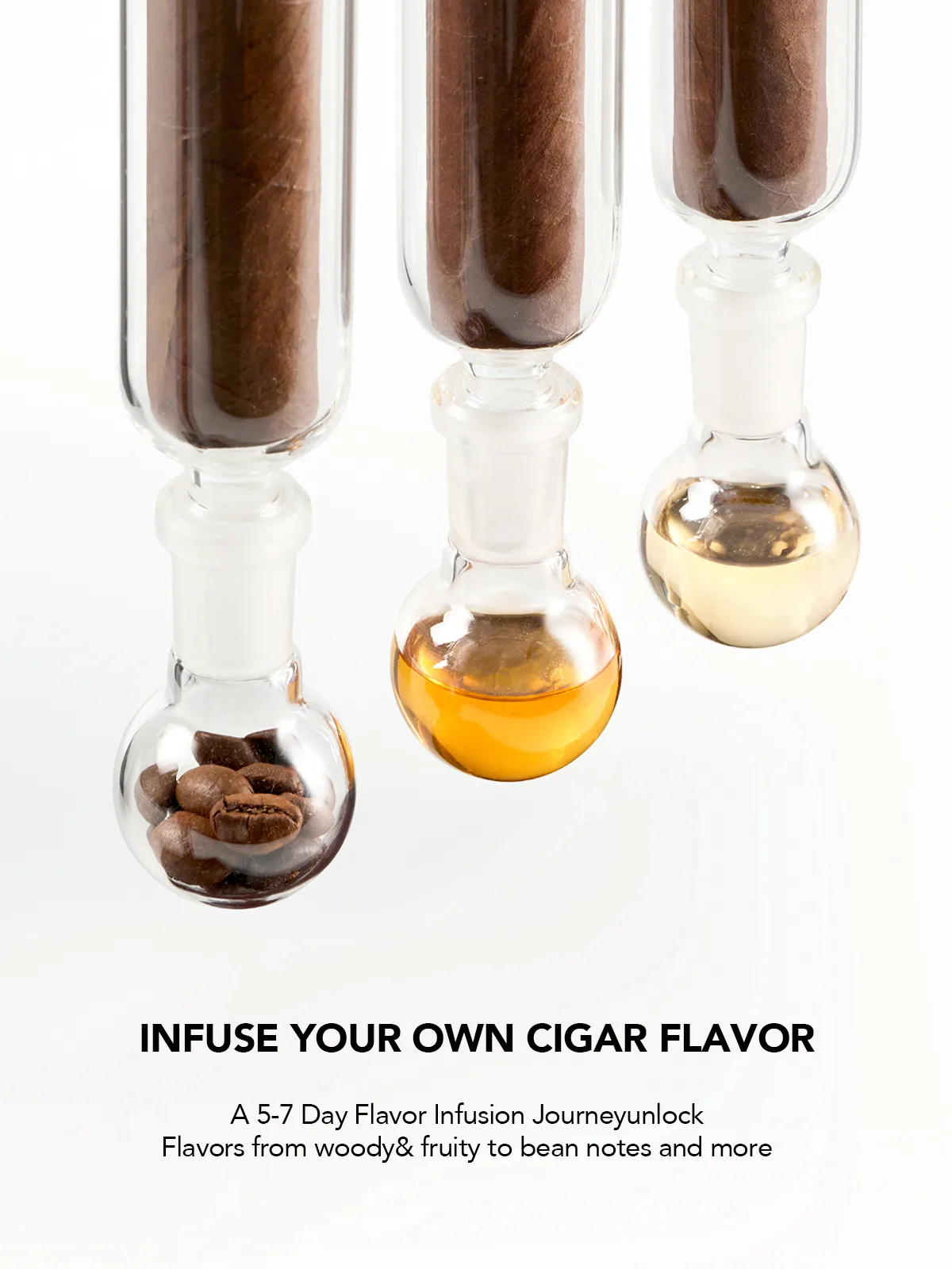 Elevate your cigar ritual. Transform your cigar’s profile by infusing it with bespoke flavors. Simply place aromatic ingredients (whiskey-soaked oak, coffee beans, or dried spices) into the glass flask, insert your cigar, and let the fusion begin. A minimalist design for purists seeking personalized depth.